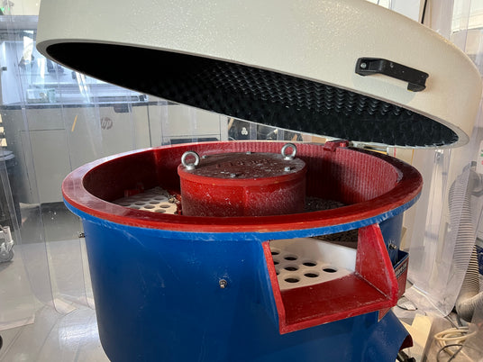 The 200L Vibro-polishing unit can be used for most parts except we would not recommend it for very fragile parts as it is a more aggressive process. “Vibro” will abrade parts to reduce any print artifacts and yield smoother parts. It is a subtractive process so can round sharp edges slightly.